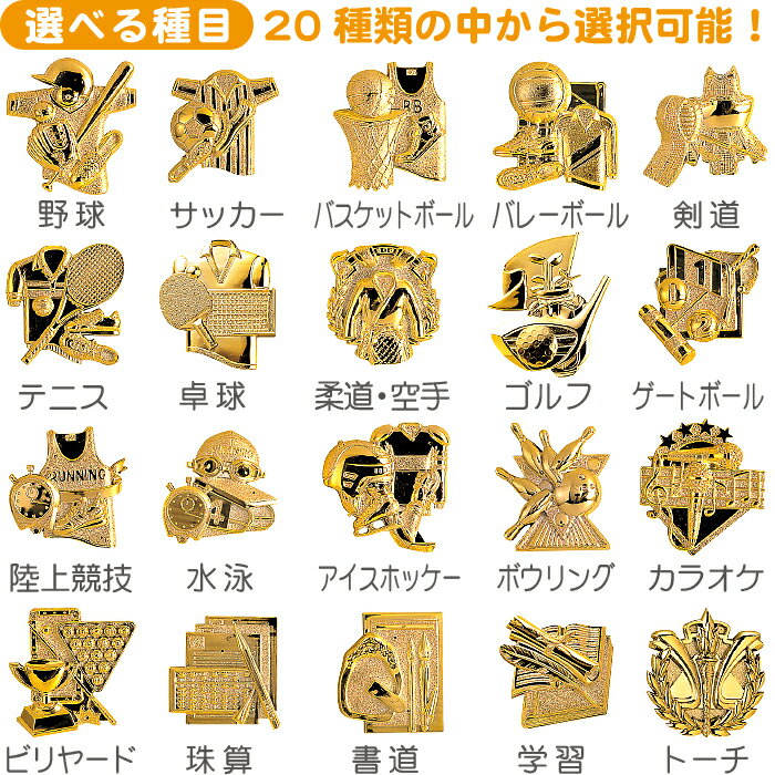20種類のレリーフ(樹脂製) 野球 サッカー バスケットボール バレーボール 剣道 テニス 卓球 柔道 空手 ゴルフ ゲートボール 陸上競技 水泳 アイスホッケー ボウリング カラオケ ビリヤード 珠算 書道 学習 トーチ 20種類の中にない種目は、万能タイプのトーチが全ての種目に対応しております。